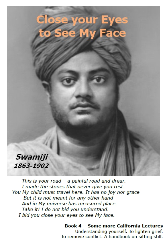 1- Has the person gone forever or does something remain? 2- Is death the end of all these things? 3- We run after everything to make ourselves happy. 4- Either believe with the nihilists (who say everything is nothing/pointless), or seek for The Real. 5- ‘Carry him, O Fire, in your arms gently, to where the fathers live, to where there is no more death’. 6- The time when no person died unless they chose to, when all was perfect and the mind was pure. 7- All have the story of the deluge – to remove all corruption. 8- The purpose of language is to express the Truth within. 9- Often behind the fine, polished phrase is arrant trash. 10- So we need not throw overboard something that doesn’t fit the notions of the moderns. 11- Huxley has said it and that is enough. 12- This modern superstition is worship of filthy lucre, lust and power. 13- For modern evolutionists, the human is the evolution of the mollusc. 14- That first mollusc or protoplasm must have contained the original energy. 15- To say the force called The Soul is from the formation of all the molecules of the body is putting the cart before the horse. 16- One thread of a spider’s web, if travelling at high velocity, has the strength of a chain. 17- I never saw anybody who could eat food for me. 18– Whatsoever has form, with its particles, requires something else behind to move it. 19- You have a Soul and I have a Soul. What is this Soul? 20- That which is beyond time, space and causation must be Infinite. 21- The Infinite cannot be Two. Two Souls are not the Reality. 22- Every Soul is Infinite. 23- When people give up the idea of the body, then they have risen to a higher ideal. 24- No one has the same body for many minutes, yet we think of it as the same body. 25- The Infinite cannot change in any way – it is absurd. 26- Old, comfortable Delusions that think we are little limited beings. 27- People are frightened when told this. 28- The more we concentrate on limited things the faster we move towards death. 29- When they can say, ”I am in all lives, I am in everybody, I am the Universe”, then will they be fearless. 30- That was your own beating heart and you did not know it. 31- Every good thought or act is simply tearing pieces from the veil. 32- That cannot be known,knowledge is ‘objectifying’, knowledge is a limitation. 33- Extreme self-denial is the centre of all morality. 34- The more this present self fades away, the more the Real Self becomes apparent. 35- Just one spark of That Infinite Fire! 36- These days we have to measure everything by its usefulness. 37- No happiness is ever found in the senses. 38- Ignorance is the mother of all selfishness, depression. 39- But with machines and material advances, it will never be. 40- Material advances only increase depression, as oil poured on the fire. 41- There are two sorts of courage. 42- ”My brother, You are That! You are That!” 43- Where the highest truths become practical. That is the greatest society. 44- There is a great tendency in modern times to talk too much and decry thought. 45- The lion cub brought up by sheep. 46- You are like the infinite sky. The same eternal blue. Clouds play at covering it for a moment, then they vanish. 47- A young man waiting for his beloved thought it was his sweetheart. 48- Say to your minds, ‘I am That, I am That‘. Let it ring day and night.